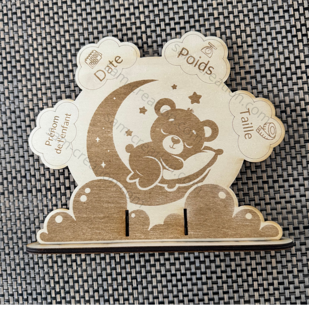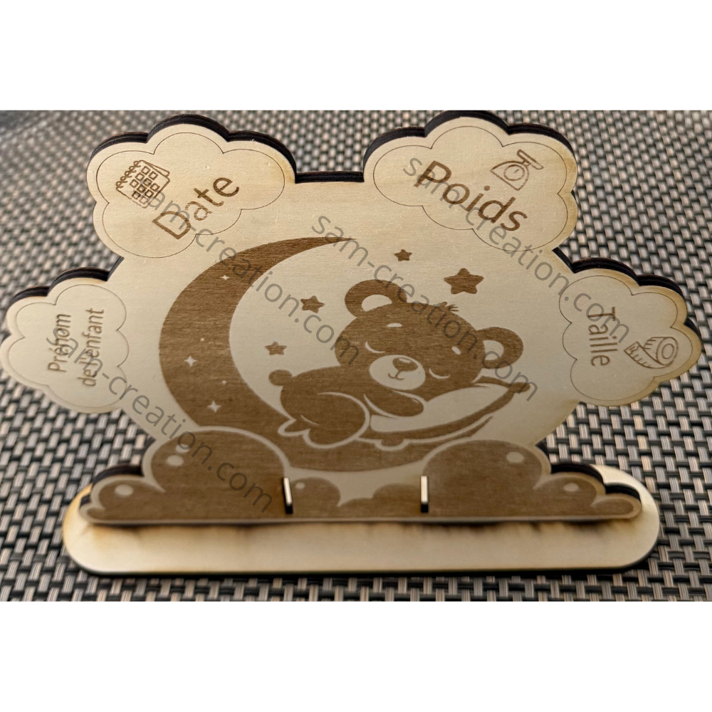 Ce cadre de naissance en bois, entièrement réalisé à la main, immortalise les premiers instants de bébé avec tendresse et authenticité.